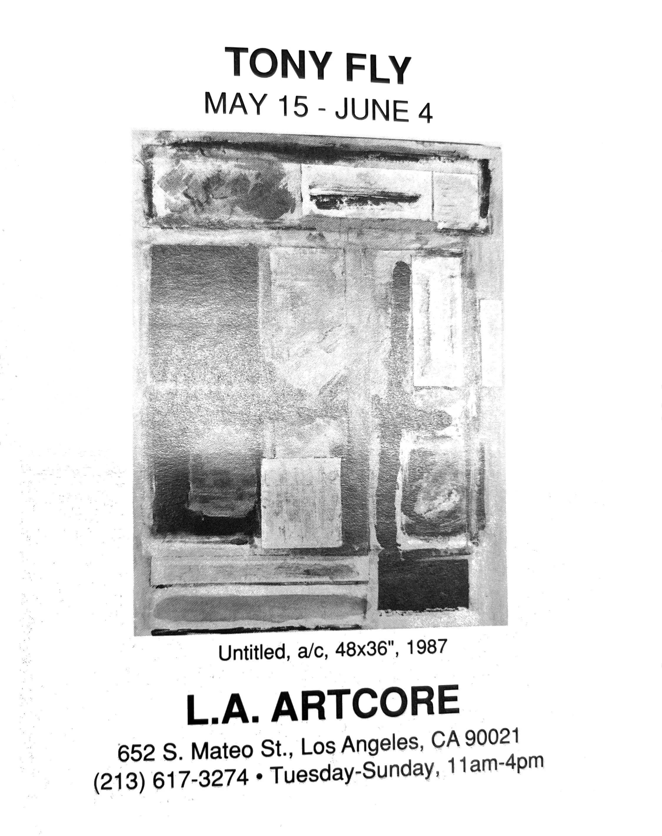 Tony Fly Friday, May 15, 1987 8:00 PM 20:00 Thursday, June 4, 1987 9:00 PM 21:00 LA Artcore 652 S. Mateo Street Los Angeles, CA, 90021 United States (map) Google Calendar ICS Tony FlyMay 15 - June 4, 1987Mateo