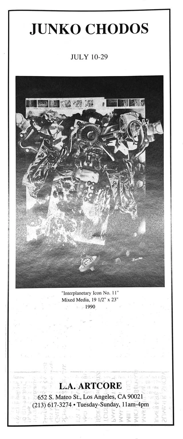 Junko Chodos Tuesday, July 10, 1990 3:30 PM 15:30 Sunday, July 29, 1990 6:30 PM 18:30 LA Artcore 652 Mateo Street Los Angeles, CA, 90021 United States (map) Google Calendar ICS Junko ChodosJuly 10-July 29, 1990Mateo