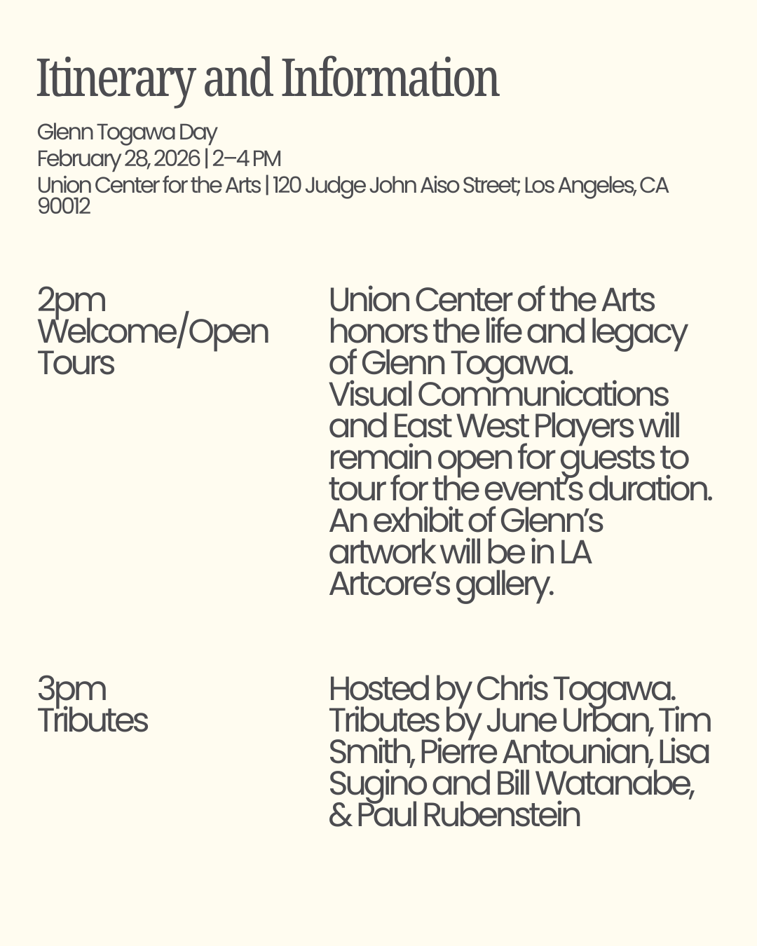 Union Center for the Arts is honoring the life and legacy of Glenn Togawa, the architect whose vision and passion for the Little Tokyo Community transformed Union Church into the Union Center for the Arts—home to the community organizations of LA Artcore, East West Players, and Visual Communications.