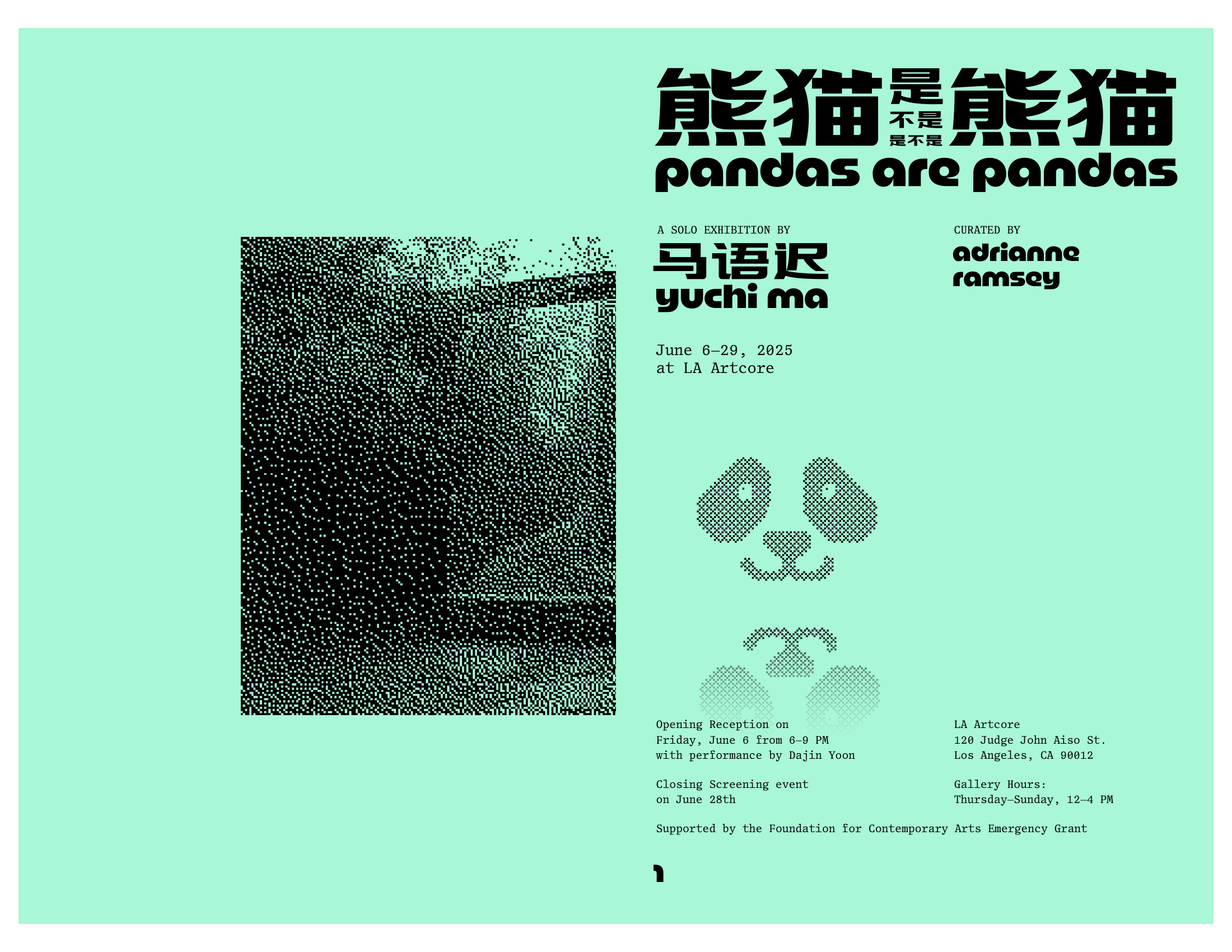 Yuchi Ma: Pandas are Pandas is made possible in part by the generous support of the Foundation for Contemporary Arts.