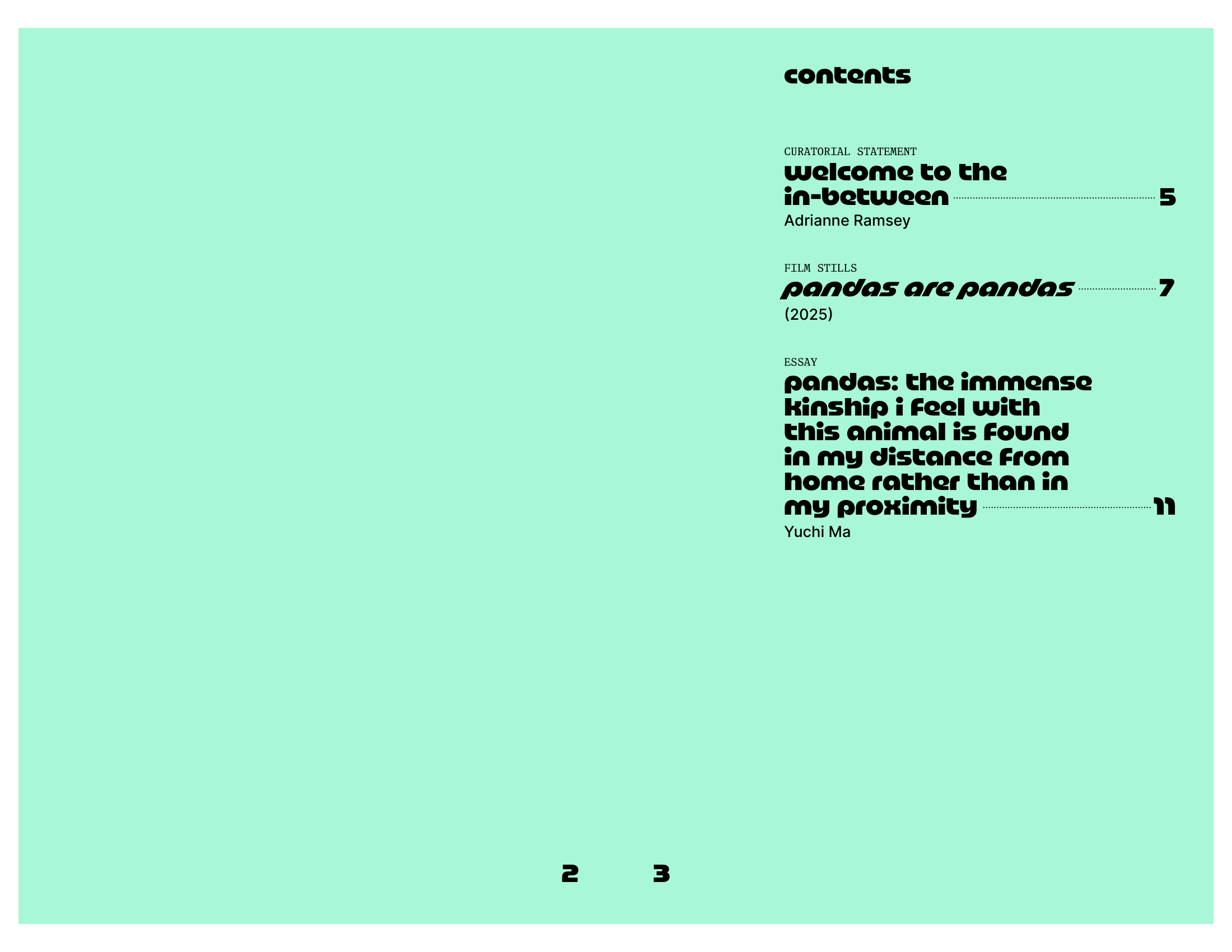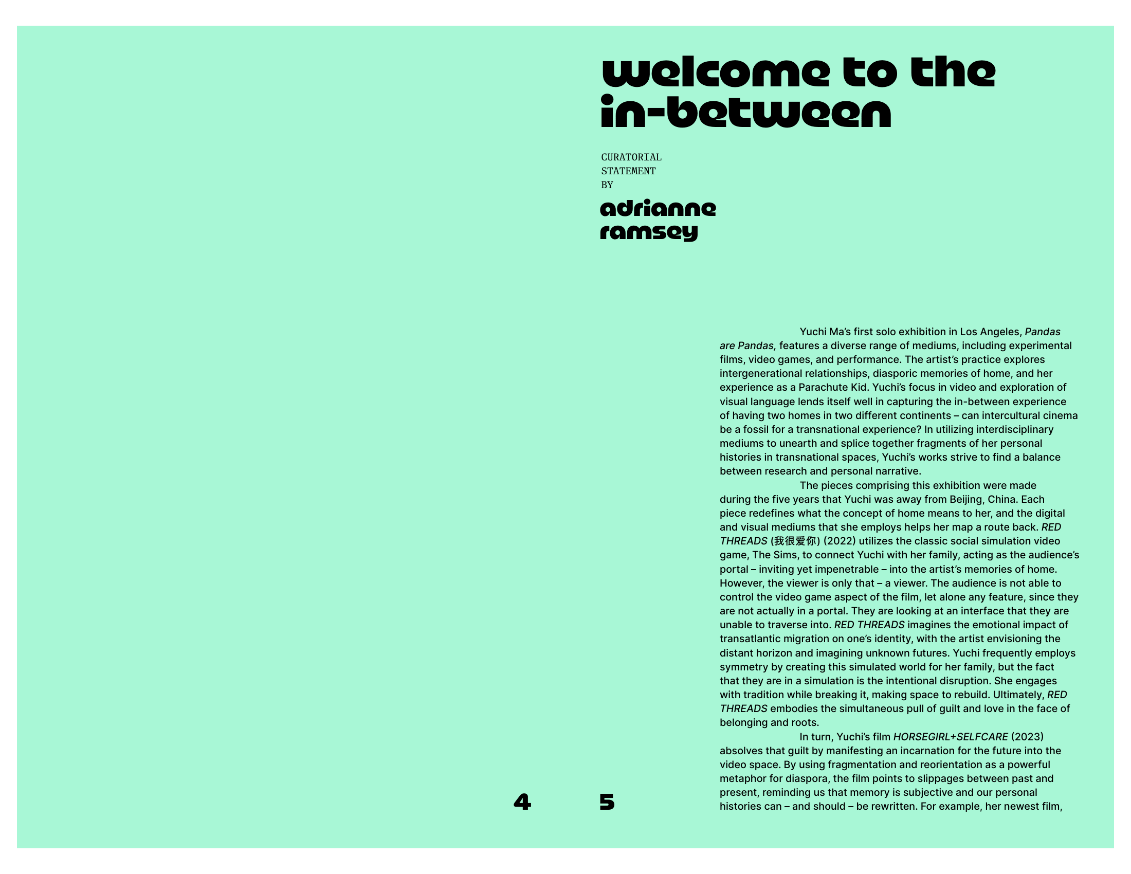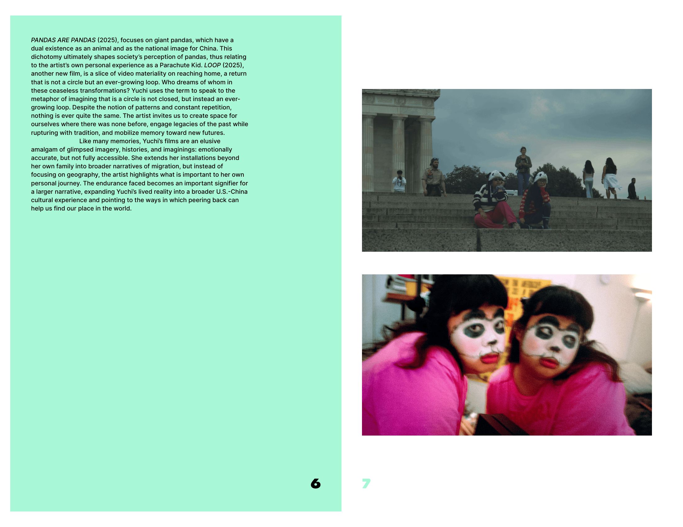 Pandas are Pandas is the first solo exhibition of filmmaker and video artist Yuchi Ma (马语迟). The artist is interested in meaning-making within intercultural experiences and believes in the manifesting potential of experimental filmmaking and video-making in resistance against the lexicon and form of commercialized language and narrative consumption. Curated by Adrianne Ramsey, the show is on view from June 6 – 29, 2025 at LA Artcore and highlights the artist’s experience as a Parachute Kid.